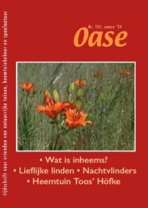 Herfstnummer 2024![]() "Het is nooit af". Interview van Machteld Klees en Paul van Eerd met bouwmeester Roelof Koster en Peter Wouda over de ecokathedraal en het gedachtegoed van Louis Le Roy; Muurtjes. Bekend en geliefd in de vorige eeuw, Deyke van Donkelaar; Ode aan de boom. Column van Tineke Heidenis; Over mortels voor muren in heemtuinen. Een tijdloos artikel van Ger Londo uit 1992; Bergen bouwen. Over het nabootsen van grootse natuur in Chinese tuinen, Pieter Jansma; Varens in de Vinex. Joop de Wilde over de groene kademuren in de Vinexwijk Vathorst, Amersfoort; Bouwen aan de kathedraal van alle Wezens. Een verhaal van Hans Engelbrecht; Bioblitz. Op zoek naar nieuwe soorten en doelgroepen in Heemtuin Presikhaaf in Arnhem. Aan het woord: beheerder Kas ven den Hofstad; Om te lezen: Het Groene Schoolplein als rijke leeromgeving, Maike Nelissen & Marc van de Geer; Schepping. Over het particuliere natuurterrein van Eef Arnolds in Holthe, Drente; Afsluitend: Veldboeket en Oase-Netwerk-nieuws. Zomernummer 2024![]() Liefelijke linden - Deyke van Donkelaar duikt in de veelzijdigheid van linden; Plek wordt tuin - column van Johan Vijfvinkel; Heemtuin Toos' Höfke - in Oldenzaal kijken buurtbewoners uit over de fraaie heemtuin; Wat is inheems? - Begrippen en twijfels op een rij, want eenvoudig is het antwoord niet. Inclusief raadsel; Valt hier iets te eten? - Jan Jaap Boehlé bericht over nachtelijke bezoekers; Klimaatslim tuinieren - de auteur van het recente boek, Moniek de Bakker, vertelt over the making of; en verder in de rubriek om te lezen: De Wilde Planten van België, van Annelies Jacobs (recensie van Machteld Klees). Volgen nog de rubriek Veldboeket met een zestal interessante notities en op de achterkant een citaat van Jac.P. Thijsse over de linde.